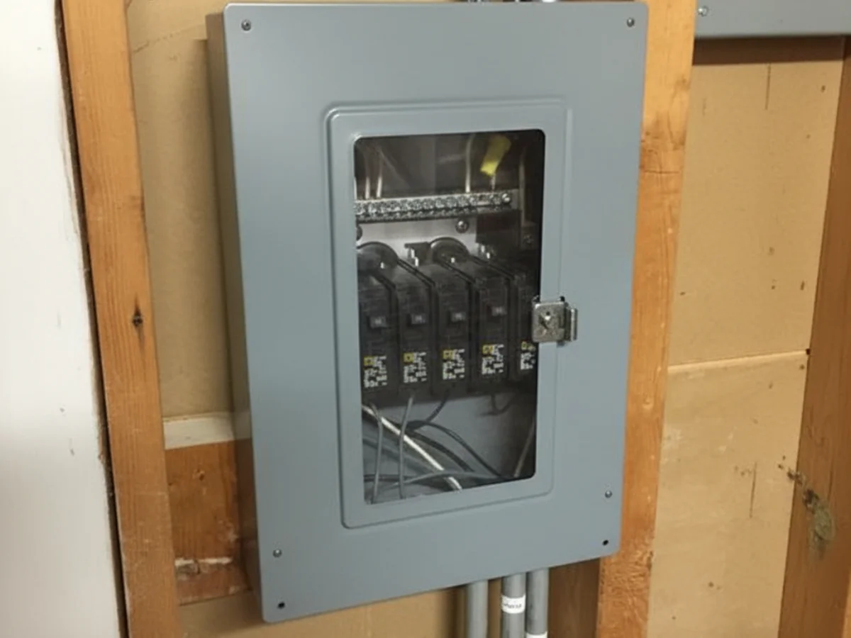 The new electrical panel is installed with proper grounding, breaker placement, and circuit organization.